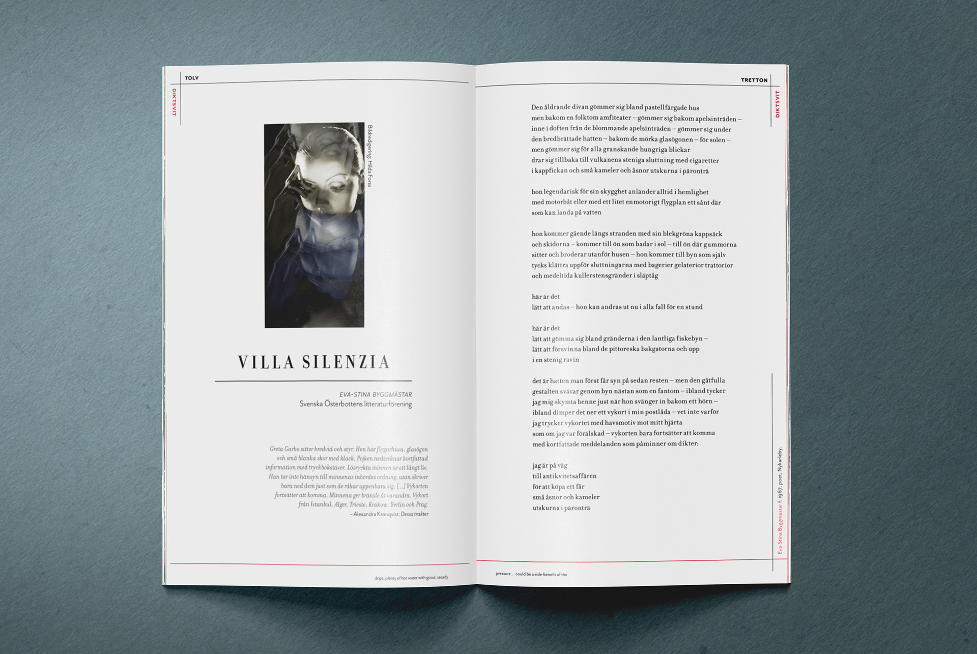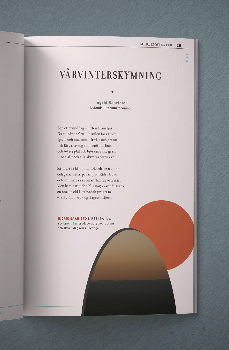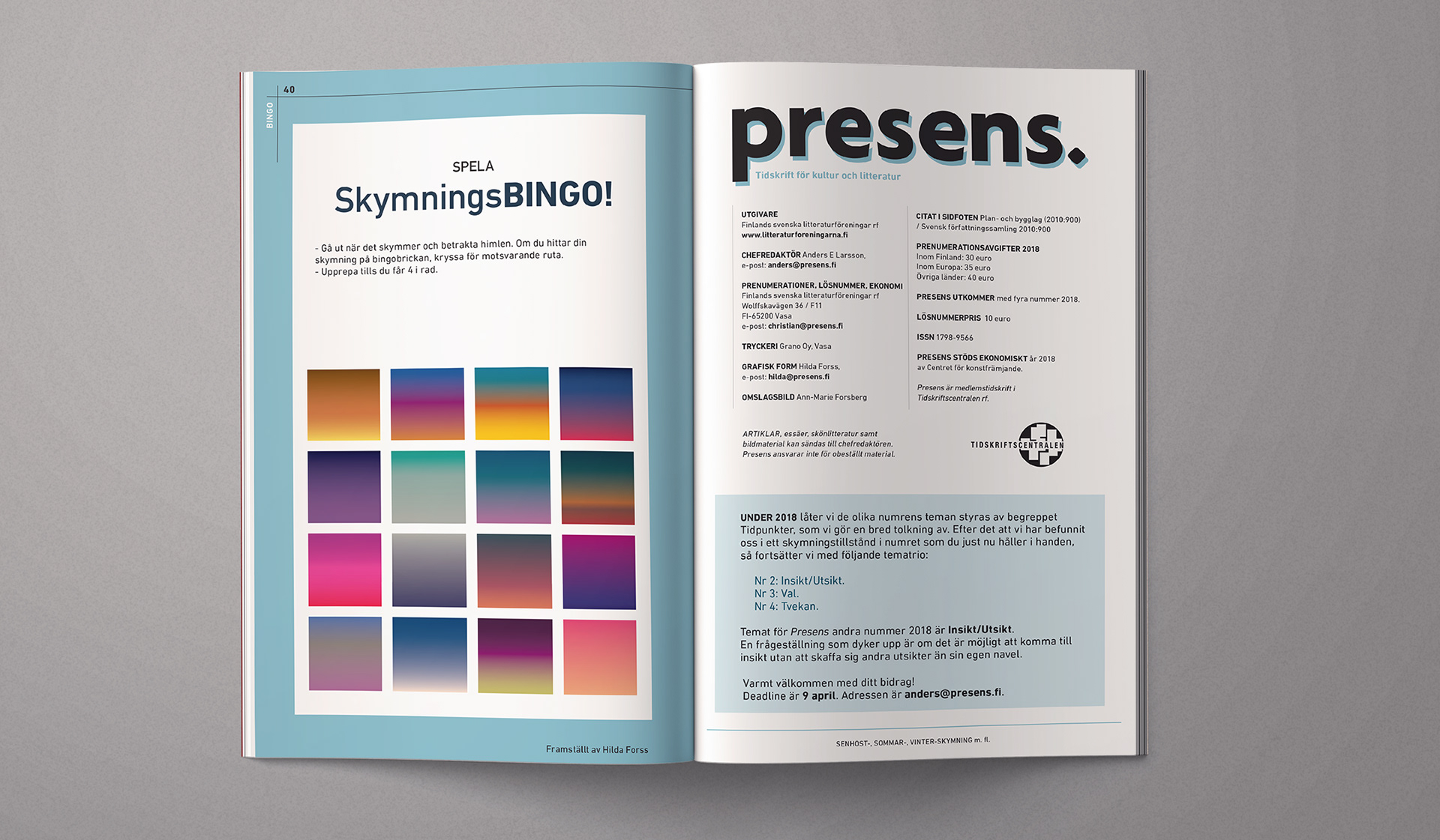 Tidskriften Presens was a literature and culture magazine issued by Finlands svenska litteraturföreningar 2010–2018. I was one of the founders of the magazine and the graphic designer since the start. In 2016 the magazine changed format to a more narrow and thicker format, perfect for poetry.